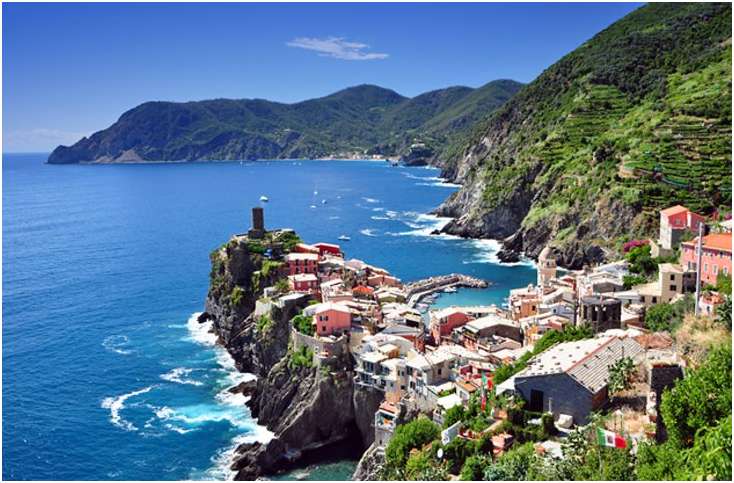 Cinque Terre is a lovely coastal region with steep hills and sheer cliffs overlooking the Mediterranean. The five picturesque villages of Monterosso al Mare, Vernazza, Corniglia, Manarola, and Riomaggiore can be reached by several means, joined to each other by walking paths, a railroad that tunnels through the headlands to emerge at each town, or a scenic narrow road high on the hillside above.