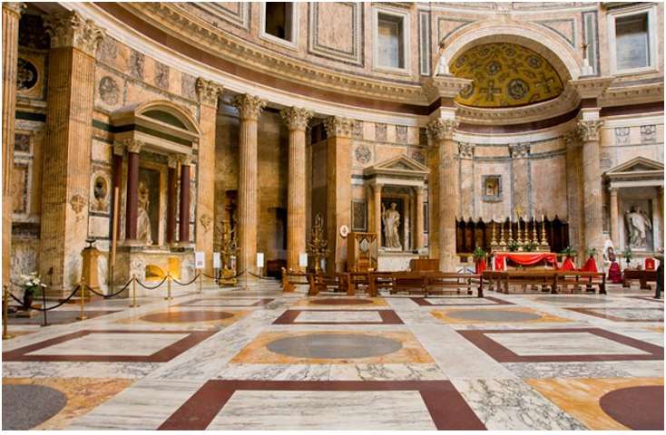 The Pantheon, an exceptionally well preserved remnant from Roman times, reveals the incredible architectural achievements of the Roman Empire. The precise proportions of the building, with the height equal to the diameter, and a single beam of light penetrating the room from the top of the dome, give the room a unique character. Italian Kings, the Renaissance painter Raphael, and other great Italians are buried in the Pantheon.